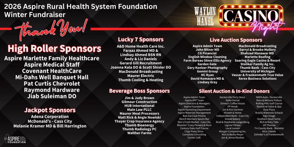 We are excited to share with you the establishment of the Aspire Rural Health System Foundation (adding Deckerville Community Hospital and merging the former – Hills and Dales Healthcare and Marlette Regional Hospital Foundations). We are united knowing that we are “better together”. This unification will significantly strengthen and expand accessibility to rural healthcare for thousands of residents in our thumb region of Michigan.